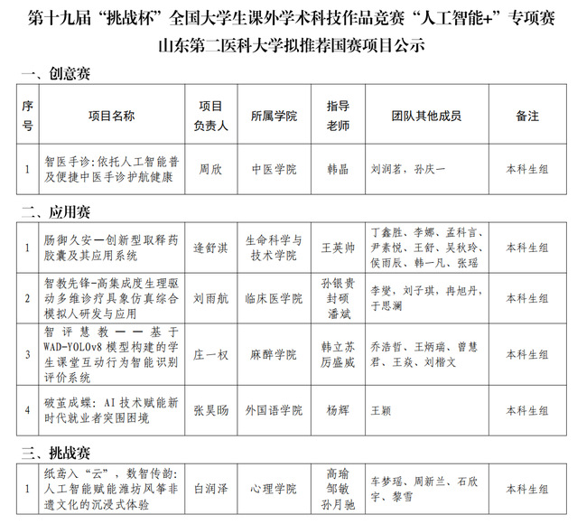 根据团省委《关于报送第十九届“挑战杯”全国大学生课外学术科技作品竞赛项目的工作提示》要求,拟推荐《智医手诊:依托人工智能普及便捷中医手诊护航健康》等作品参加国赛,现予以公示。