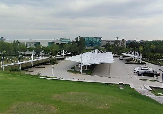 该车棚采用环保膜结构,共分三个停车区,总面积约1090平方米,形成了完整的遮阳防护体系,能够有效阻挡烈日,车内温度较露天停放大幅降低,同时具备防雨防雪性能,让出行更安全便捷。这座爱心车棚的落地,是学校与医药协同产教融合实训中心项目参建单位以“红色工地”创建为纽带,不断深化党建与业务融合的缩影。
