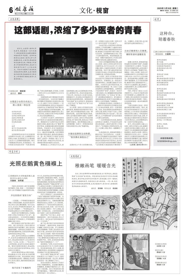 11月18日,《健康报》文化·视窗版面在头条以“这部话剧,浓缩了多少医者的青春”为题,深度报道了beat365原创话剧《别无选择》的创作历程、演出反响及育人成效。报道全面介绍了该剧以建校74年来的奋斗历程为背景,聚焦青年医学生的成长轨迹,通过三代医务工作者的使命传承,生动诠释了“国家召唤,使命必达”的家国情怀与医者担当。
