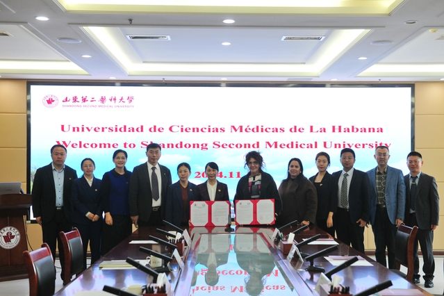 On November 5th, President Mairim de la Caridad Lago Queija and Vice President Magdemily Fallat Ramos of Universidad de Ciencias Médicas de La Habana, Cuba, along with their delegation, visited Shandong Second Medical University. President Guan Yingjun met with the delegation and signed an agreement, while vice president Cheng Min also attended the event. GuanYingjun warmly welcomed the delegation led by Mairim de la Caridad Lago Queija,and introduced the school's development history, educational characteristics,and international cooperation endeavors. She points out that Universidad deCiencias Médicas de La Habana has a long history and is the most prestigious medical university in Cuba, with distinct advantages in medical education and clinical research. The two universities share a high degree of compatibility in disciplines such as clinical medicine, stomatology, medical imaging, and nursing, bringing broad prospects for cooperation. Shandong Second Medical University will fully support the cooperation between the two universities, creating conditions and providing guarantee to promote this partnership. She hopes that the two universities can strengthen communication, maintain close exchanges, and engage in pragmatic cooperation, contributing wisdom and strength to promoting educational exchanges between China and Cuba. Mairimde la Caridad Lago Queija expressed her gratitude for the warm reception extended by Shandong Second Medical University. She introduced the school-running situation of Universidad de Ciencias Médicas de La Habana and spoke highly of Shandong Second Medical University's discipline construction and educational achievements. She sincerely invited a delegation from Shandong Second MedicalUniversity to visit Universidad de Ciencias Médicas de La Habana as soon as possible and expressed her strong anticipation for jointly exploring new models of talent cultivation, teacher exchange, and joint scientific research cooperation with Shandong Second Medical University, in order to promote the vigorous development of Universidad de Ciencias Médicas de La Habana as well as Sino-Cuban medical education. Duringthe meeting, on behalf of their respective universities, Guan Yingjun andMairim de la Caridad Lago Queija signed an agreement on joint student cultivation. Both sides conducted in-depth discussions and exchanges on the implementation details of joint cultivation for students majoring in clinical medicine, stomatology, and medical imaging, and also exchanged views on academic exchanges and scientific research cooperation, laying the foundationfor comprehensive and mutually beneficial cooperation. Afterthe meeting, Mairim de la Caridad Lago Queija and her delegation visited ShandongSecond Medical University's culture and sports center. The relevant officials from the Party Committee Office (the University Office),International Cooperation and Exchange Office (International EducationCollege), Development Planning Office (Office of Serving Local Areas), Academic Affairs Office, Graduate Office (Discipline Construction Office), School of Stomatology, and School of Medical Imaging participated in the event.